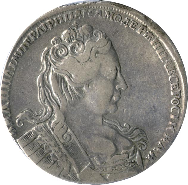 Таким образом, проба монет 1730-го года — 729, нормативный вес — 28,44 грамма; проба монет 1731 года — 802, нормативный вес — 25,85 грамма. Гурт — узор.
