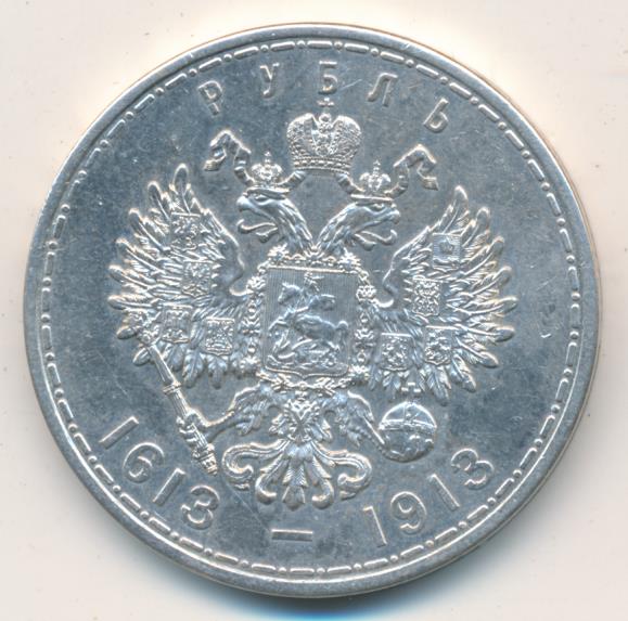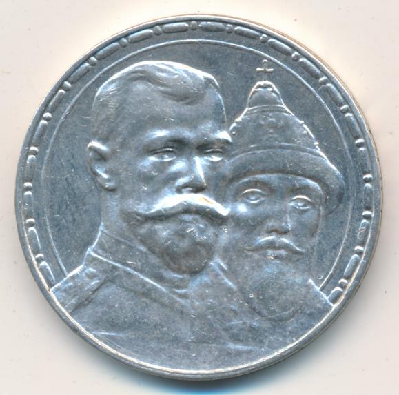 К 300-летию царствования Дома Романовых выпустили и юбилейный рубль, отчеканенный грандиозным тиражом почти в полтора миллиона экземпляров. На лицевой стороне монеты разместили портрет императора Николая II в военной форме, за спиной которого виден основатель династии, царь Михаил Романов в царском одеянии и в шапке Мономаха.
