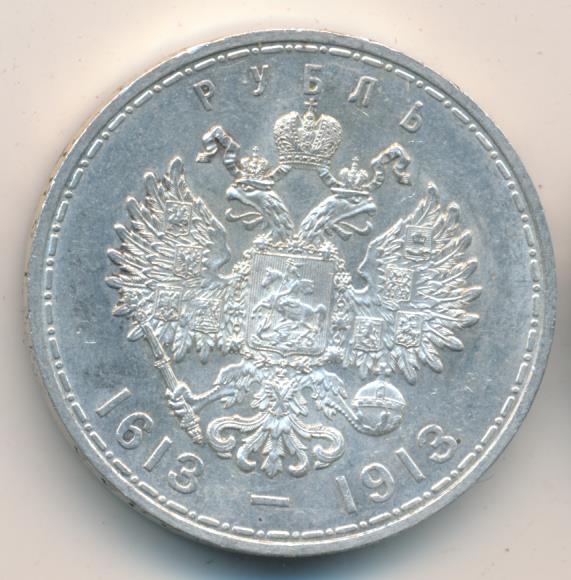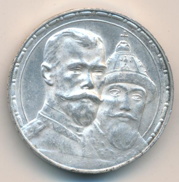 К 300-летию царствования Дома Романовых выпустили и юбилейный рубль, отчеканенный грандиозным тиражом почти в полтора миллиона экземпляров. На лицевой стороне монеты разместили портрет императора Николая II в военной форме, за спиной которого виден основатель династии, царь Михаил Романов в царском одеянии и в шапке Мономаха.