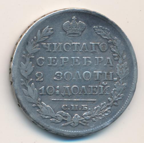 Лицевая сторона - двуглавый орел, дата и надпись «МОНЕТА РУБЛЬ», оборотная — окруженная венком из лавровой и дубовой ветвей надпись «ЧИСТАГО СЕРЕБРА 2 ЗОЛОТН 10 ДОЛЕЙ». Проба — 868, нормативный вес — 10,37 грамма.