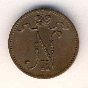 Лицевая сторона — вензель Александра II, оборотная — номинал (1 PENNIA) и дата. Нормативный вес — 1,28 грамма, гурт гладкий.