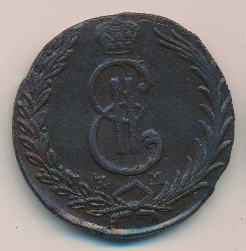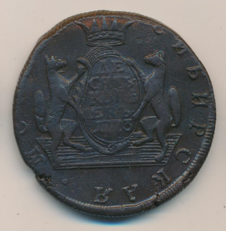 Лицевая сторона - два соболя поддерживают щит с обозначением номинала (десять копеекъ) под короной, надпись «СИБИРСКАЯ МОНЕТА». Оборотная — вензель Екатерины II в венке из пальмовой и лавровой ветвей. Вес — 65, 52 грамма. Нормативный вес — 65,52 грамма, это самая увесистая медная монета регулярного чекана в истории российской нумизматики. Гурт — надпись «колыванская медь» или шнур.