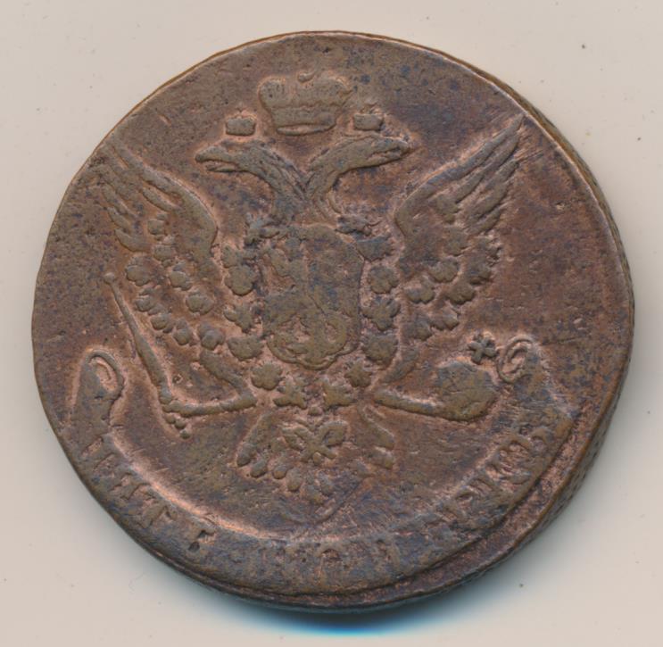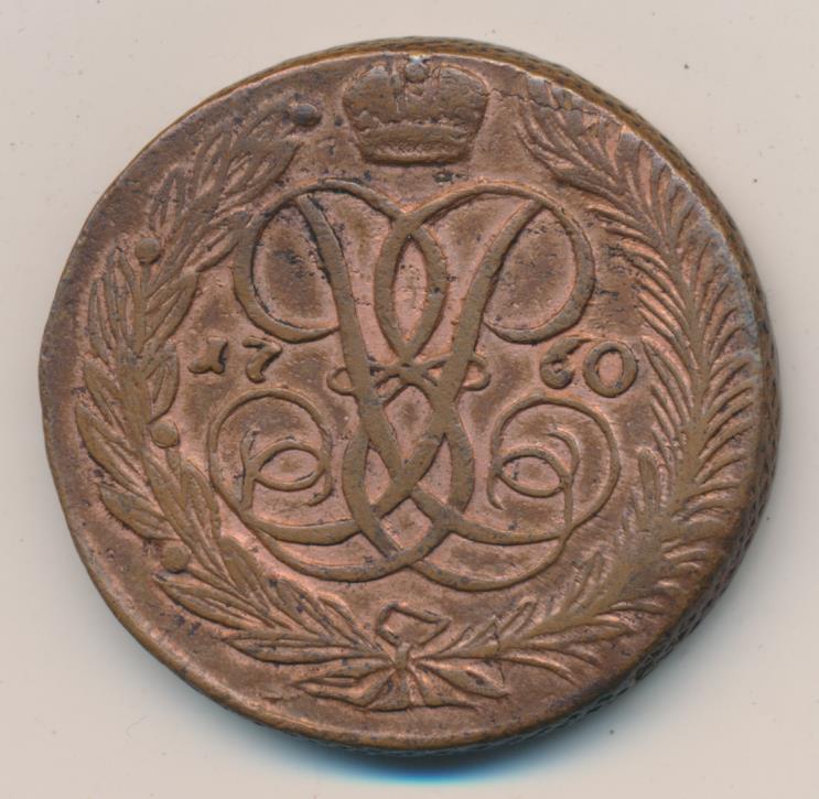 Лицевая сторона — двуглавый орел и обозначение номинала (пять копеекъ), оборотная — сложный симметричный вензель Елизаветы Петровны и дата. Нормативный вес — 51,19 грамма, гурт — сетка.