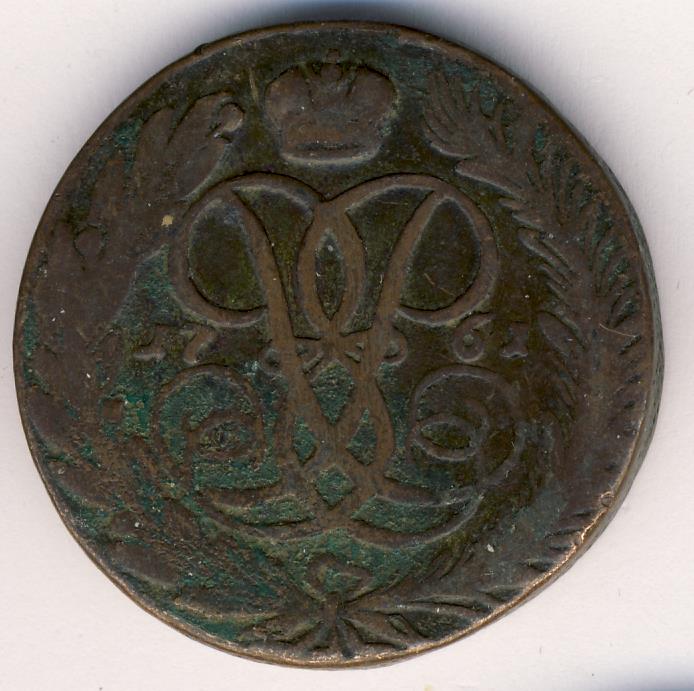 Лицевая сторона — двуглавый орел и обозначение номинала (пять копеекъ), оборотная — сложный симметричный вензель Елизаветы Петровны и дата. Нормативный вес — 51,19 грамма, гурт — сетка.