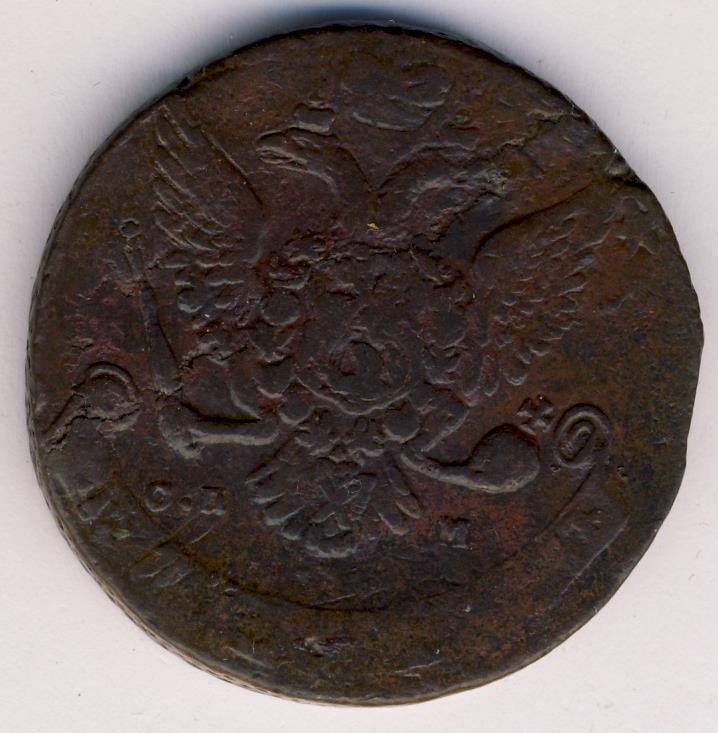 Лицевая сторона — двуглавый орел (выделяют 17 типов орла) и обозначение номинала (пять копеекъ), оборотная — вензель Екатерины II и дата. Нормативный вес — 51,19 грамма, гурт — сетка или шнур.
