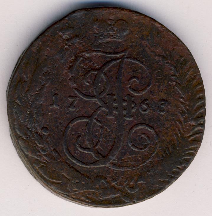 Указом от 27 января 1763 года Екатерина II прекращает перечеканку тяжелых монет 16-рублевой стопы в легкие (32-рублевой стопы) и начинает обратный процесс. Медные монеты приобретают тот же вид, что они имели при Елизавете, меняется лишь вензель императрицы.