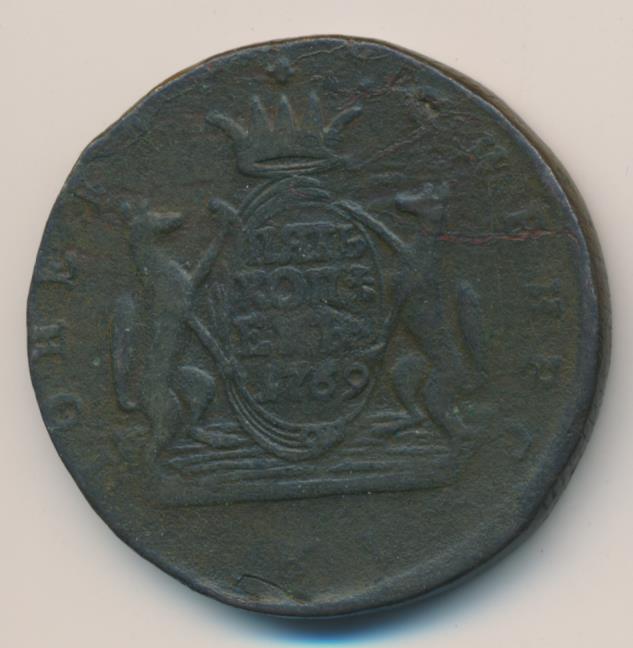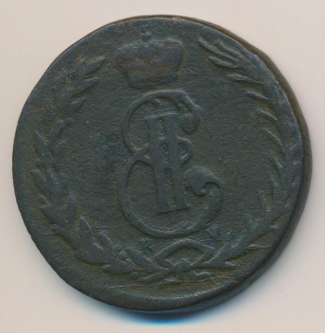 Лицевая сторона - два соболя поддерживают щит с обозначением номинала (пять копеекъ) под короной, надпись «СИБИРСКАЯ МОНЕТА». Оборотная — вензель Екатерины II в венке из пальмовой и лавровой ветвей. Гурт — надпись «колыванская медь» или шнур. Вес — 32,76 грамма.