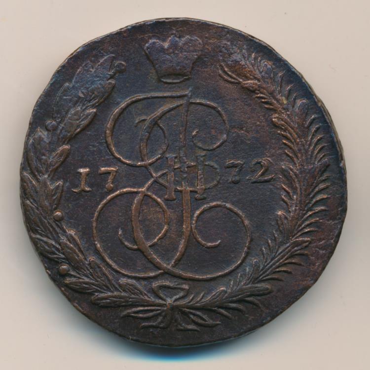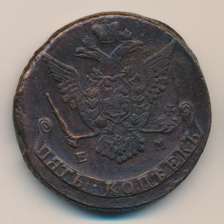 Лицевая сторона — двуглавый орел (выделяют 17 типов орла) и обозначение номинала (пять копеекъ), оборотная — вензель Екатерины II и дата. Нормативный вес — 51,19 грамма, гурт — сетка или шнур.