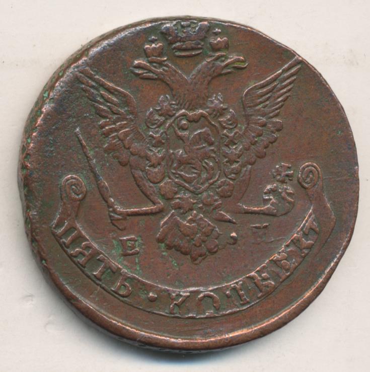 Лицевая сторона — двуглавый орел (выделяют 17 типов орла) и обозначение номинала (пять копеекъ), оборотная — вензель Екатерины II и дата. Нормативный вес — 51,19 грамма, гурт — сетка или шнур.