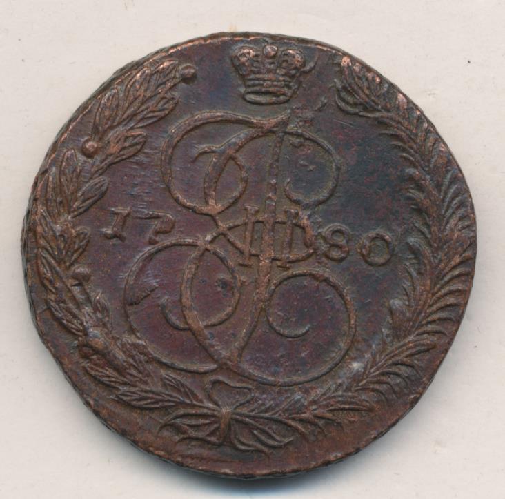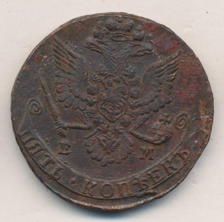 Лицевая сторона — двуглавый орел (выделяют 17 типов орла) и обозначение номинала (пять копеекъ), оборотная — вензель Екатерины II и дата. Нормативный вес — 51,19 грамма, гурт — сетка или шнур.