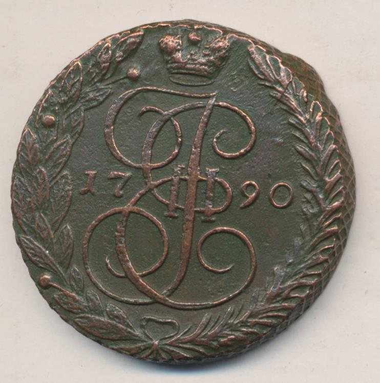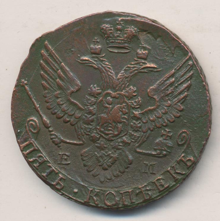 Лицевая сторона — двуглавый орел (выделяют 17 типов орла) и обозначение номинала (пять копеекъ), оборотная — вензель Екатерины II и дата. Нормативный вес — 51,19 грамма, гурт — сетка или шнур.