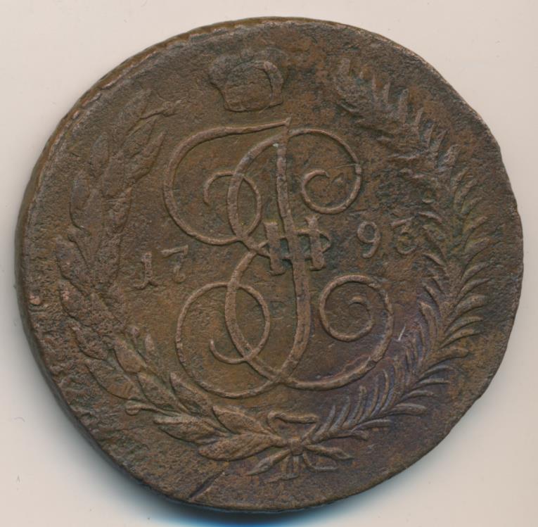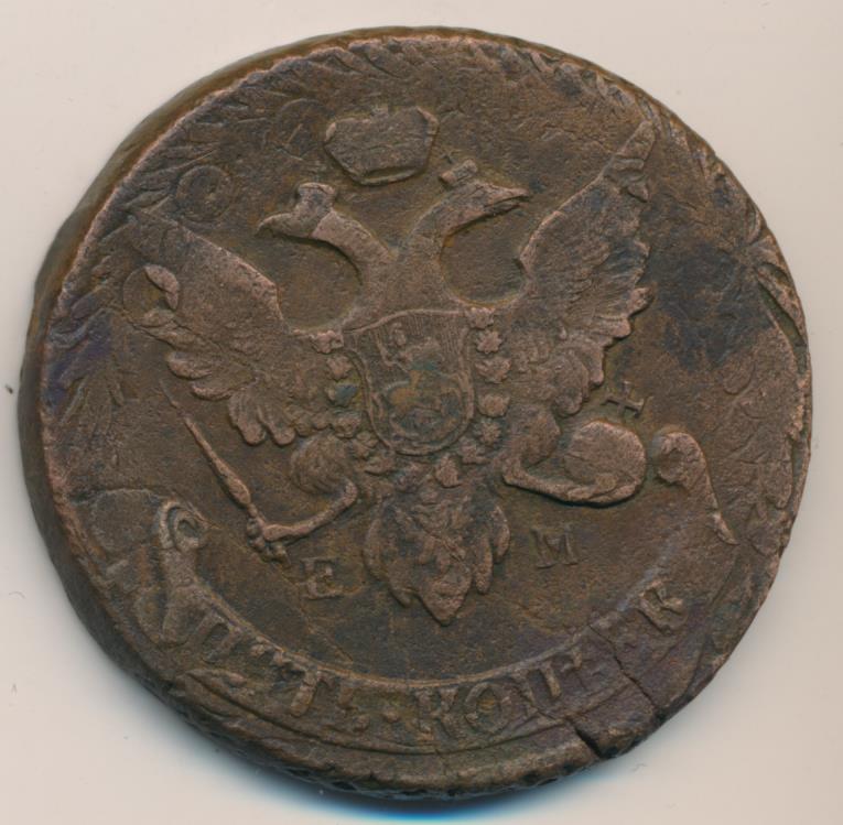 Лицевая сторона — двуглавый орел (выделяют 17 типов орла) и обозначение номинала (пять копеекъ), оборотная — вензель Екатерины II и дата. Нормативный вес — 51,19 грамма, гурт — сетка или шнур.
