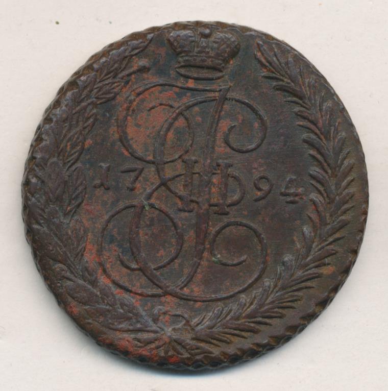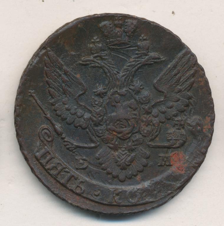 Лицевая сторона — двуглавый орел (выделяют 17 типов орла) и обозначение номинала (пять копеекъ), оборотная — вензель Екатерины II и дата. Нормативный вес — 51,19 грамма, гурт — сетка или шнур.
