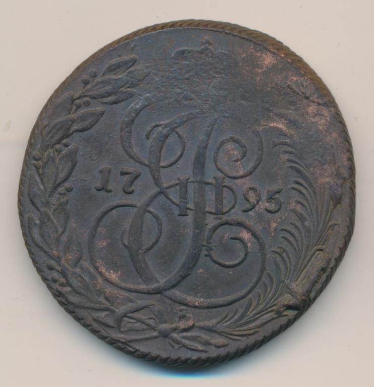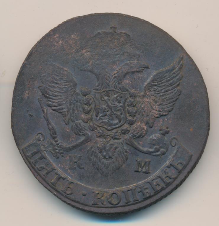 Лицевая сторона — двуглавый орел (выделяют 17 типов орла) и обозначение номинала (пять копеекъ), оборотная — вензель Екатерины II и дата. Нормативный вес — 51,19 грамма, гурт — сетка или шнур.
