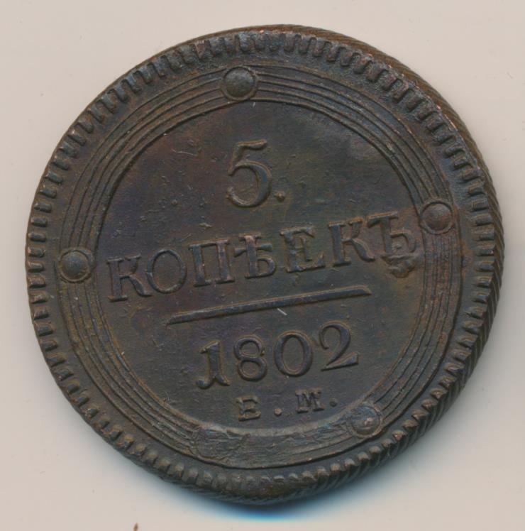 Выделка монет ведется только на Екатеринбургском (знак ЕМ)и Сузунском (знак КМ) дворах, причем в основном пятикопеечников. Номиналы от копейки и ниже выпускаются в очень незначительных количествах. Выделяют пять типов орла — три екатеринбургских и два сузунских; сузунские пятикопеечники 1802 года известны с зубчатым ободком вокруг линейных колец на обеих сторонах и без него, по встречаемости они примерно одинаковы.