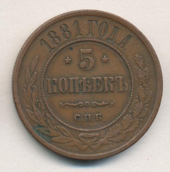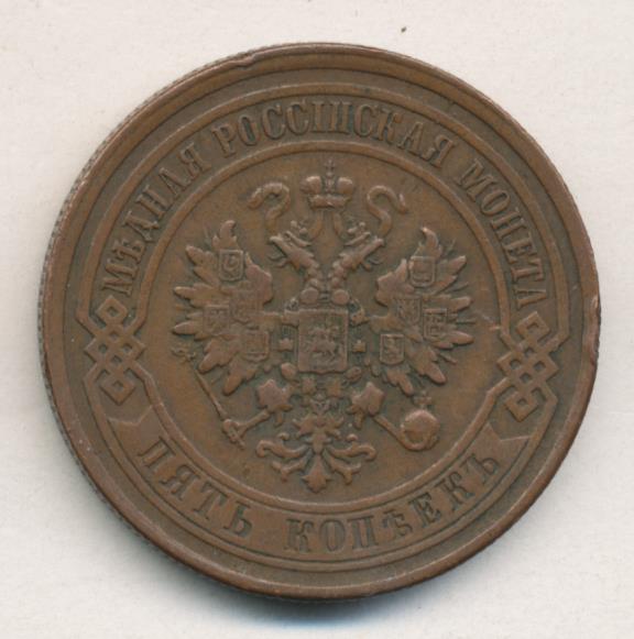 Лицевая сторона — двуглавый орел, надпись МЕДНАЯ РОССIЙСКАЯ МОНЕТА и обозначение номинала (пять копеекъ); оборотная — обозначение номинала (5 копеекъ) в бусовом ободке и дата. Нормативный вес — 16,38 грамма, гурт рубчатый.