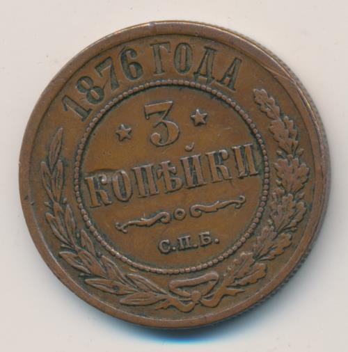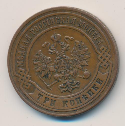 Лицевая сторона — двуглавый орел, надпись МЕДНАЯ РОССIЙСКАЯ МОНЕТА и обозначение номинала (три копейки); оборотная — обозначение номинала (3 копейки) в бусовом ободке и дата. Нормативный вес — 9,83 грамма, гурт рубчатый.