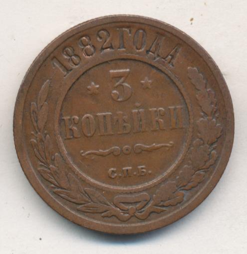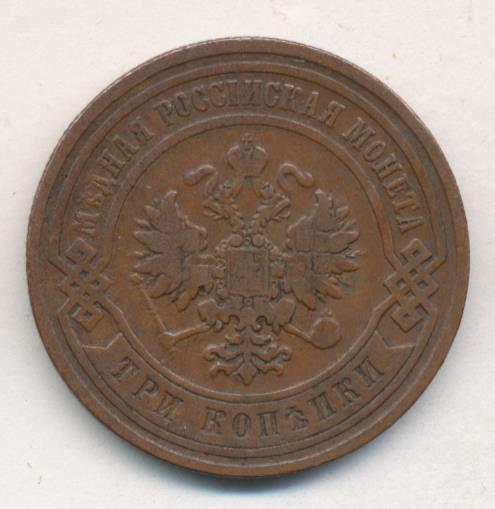 Лицевая сторона — двуглавый орел, надпись МЕДНАЯ РОССIЙСКАЯ МОНЕТА и обозначение номинала (три копейки); оборотная — обозначение номинала (3 копейки) в бусовом ободке и дата. Нормативный вес — 9,83 грамма, гурт рубчатый.