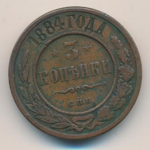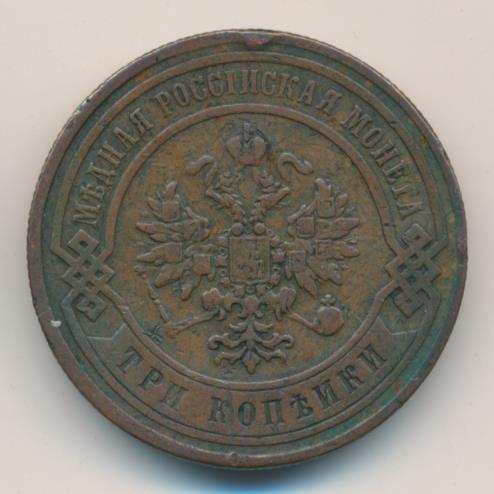 Лицевая сторона — двуглавый орел, надпись МЕДНАЯ РОССIЙСКАЯ МОНЕТА и обозначение номинала (три копейки); оборотная — обозначение номинала (3 копейки) в бусовом ободке и дата. Нормативный вес — 9,83 грамма, гурт рубчатый.
