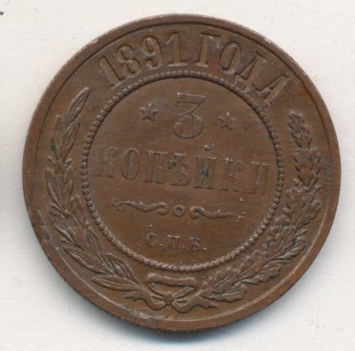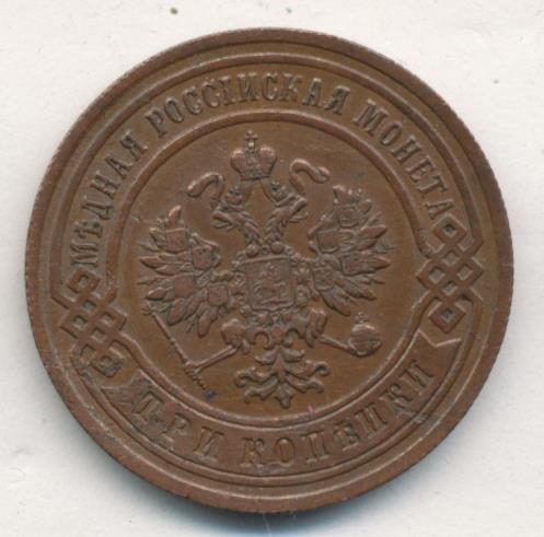 Лицевая сторона — двуглавый орел, надпись МЕДНАЯ РОССIЙСКАЯ МОНЕТА и обозначение номинала (три копейки); оборотная — обозначение номинала (3 копейки) в бусовом ободке и дата. Нормативный вес — 9,83 грамма, гурт рубчатый.