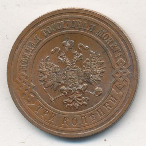 Лицевая сторона — двуглавый орел, надпись МЕДНАЯ РОССIЙСКАЯ МОНЕТА и обозначение номинала (три копейки); оборотная — обозначение номинала (3 копейки) в бусовом ободке и дата. Нормативный вес — 9,83 грамма, гурт рубчатый.