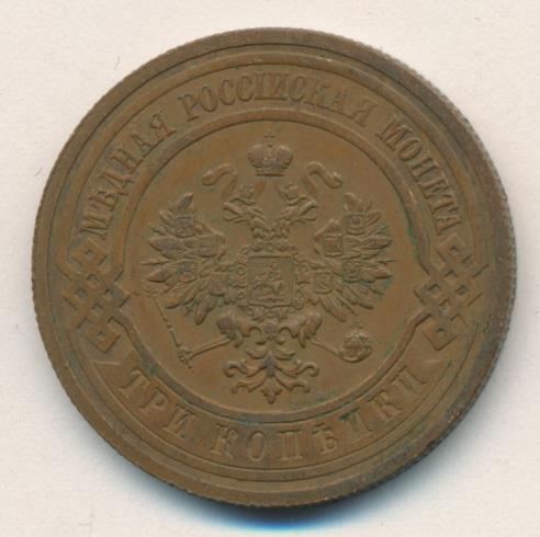 Лицевая сторона — двуглавый орел, надпись МЕДНАЯ РОССIЙСКАЯ МОНЕТА и обозначение номинала (три копейки); оборотная — обозначение номинала (3 копейки) в бусовом ободке и дата. Нормативный вес — 9,83 грамма, гурт рубчатый.