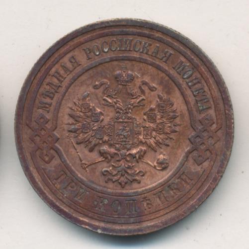 Лицевая сторона — двуглавый орел, надпись МЕДНАЯ РОССIЙСКАЯ МОНЕТА и обозначение номинала (три копейки); оборотная — обозначение номинала (3 копейки) в бусовом ободке и дата. Нормативный вес — 9,83 грамма, гурт рубчатый.