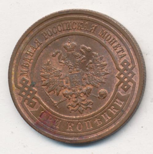 Лицевая сторона — двуглавый орел, надпись МЕДНАЯ РОССIЙСКАЯ МОНЕТА и обозначение номинала (три копейки); оборотная — обозначение номинала (3 копейки) в бусовом ободке и дата. Нормативный вес — 9,83 грамма, гурт рубчатый.