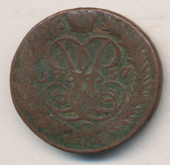 Указ от 8 апреля 1757 года вводит эту норму для новых двухкопеечника, копейки, денги и полушки. Значительная часть двухкопеечников этой серии перечеканены из «облачной» копейки 8-рублевой стопы, реже из «крестового» пятака 40-рублевой стопы. Для перечеканов готовятся особые штемпели лицевой стороны с номиналом над всадником (для большей четкости изображения). На практике эти штемпели используются и для тиснения гладких кружков.