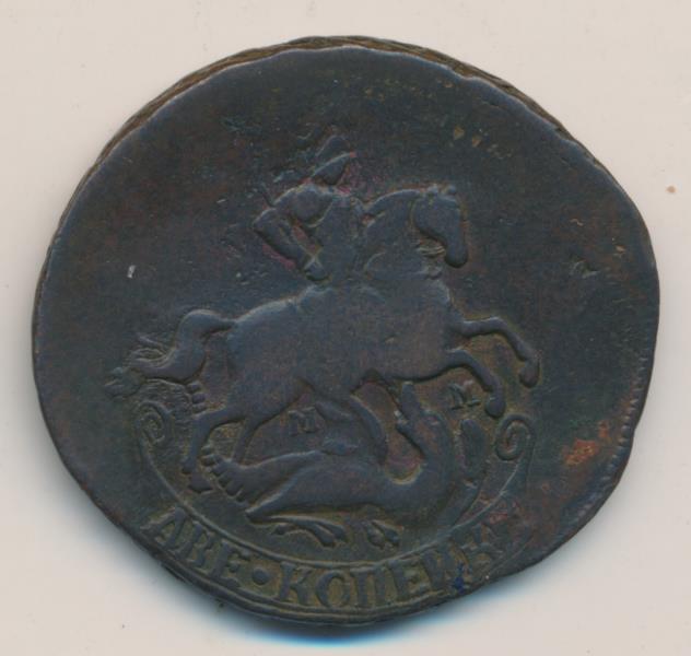 Лицевая сторона — Георгий Победоносец и обозначение номинала (две копейки) в картуше, оборотная — вензель Екатерины II и дата. Нормативный вес — 20,48 грамма, гурт — сетка или шнур.