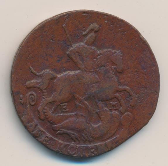 Лицевая сторона — Георгий Победоносец и обозначение номинала (две копейки) в картуше, оборотная — вензель Екатерины II и дата. Нормативный вес — 20,48 грамма, гурт — сетка или шнур.