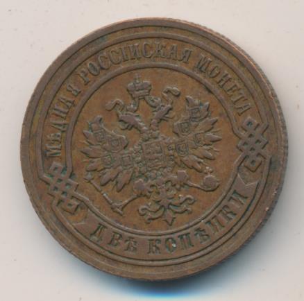 Лицевая сторона — двуглавый орел, надпись МЕДНАЯ РОССIЙСКАЯ МОНЕТА и обозначение номинала (две копейки); оборотная — обозначение номинала (2 копейки) в бусовом ободке и дата. Нормативный вес — 6,55 грамма, гурт рубчатый.