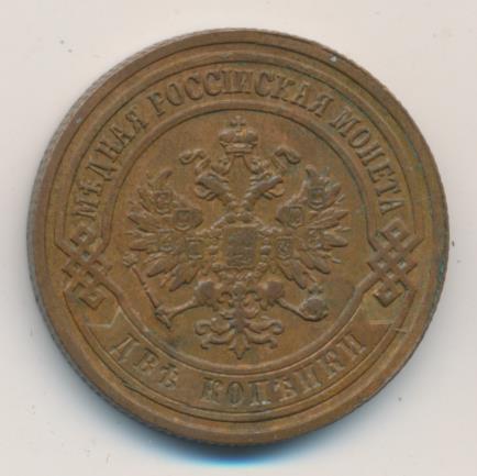 Лицевая сторона — двуглавый орел, надпись МЕДНАЯ РОССIЙСКАЯ МОНЕТА и обозначение номинала (две копейки); оборотная — обозначение номинала (2 копейки) в бусовом ободке и дата. Нормативный вес — 6,55 грамма, гурт рубчатый.