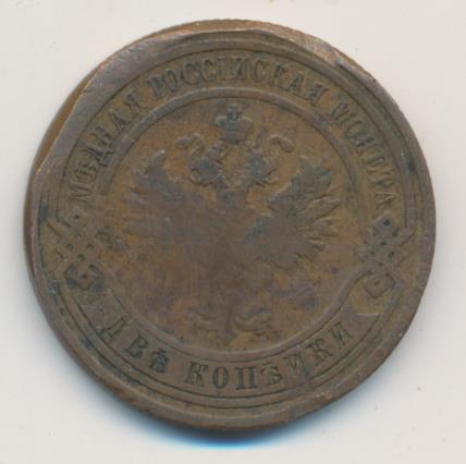 Лицевая сторона — двуглавый орел, надпись МЕДНАЯ РОССIЙСКАЯ МОНЕТА и обозначение номинала (две копейки); оборотная — обозначение номинала (2 копейки) в бусовом ободке и дата. Нормативный вес — 6,55 грамма, гурт рубчатый.
