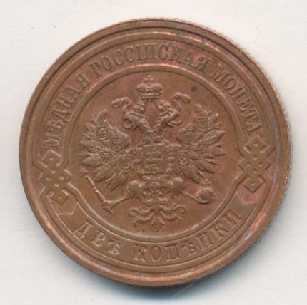Лицевая сторона — двуглавый орел, надпись МЕДНАЯ РОССIЙСКАЯ МОНЕТА и обозначение номинала (две копейки); оборотная — обозначение номинала (2 копейки) в бусовом ободке и дата. Нормативный вес — 6,55 грамма, гурт рубчатый.
