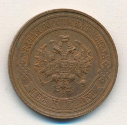 Лицевая сторона — двуглавый орел, надпись МЕДНАЯ РОССIЙСКАЯ МОНЕТА и обозначение номинала (две копейки); оборотная — обозначение номинала (2 копейки) в бусовом ободке и дата. Нормативный вес — 6,55 грамма, гурт рубчатый.