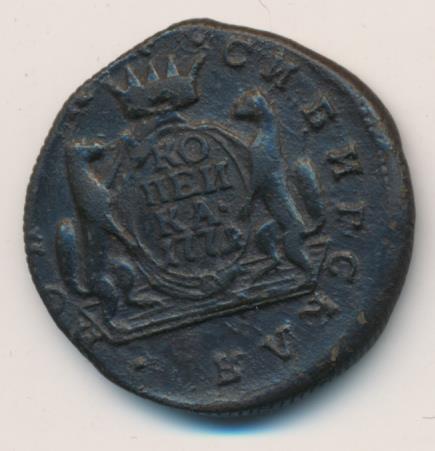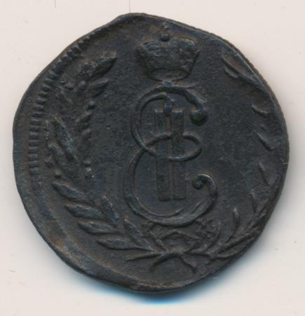 Лицевая сторона - два соболя поддерживают щит с обозначением номинала (копейка) под короной, надпись «СИБИРСКАЯ МОНЕТА». Оборотная — вензель Екатерины II в венке из пальмовой и лавровой ветвей. Гурт — шнур, вес — 6,55 грамма.