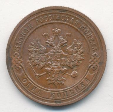 Лицевая сторона — двуглавый орел, надпись МЕДНАЯ РОССIЙСКАЯ МОНЕТА и обозначение номинала (одна копейка); оборотная — обозначение номинала (1 копейка) в бусовом ободке и дата. Нормативный вес — 3,28 грамма, гурт рубчатый.