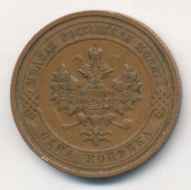 Лицевая сторона — двуглавый орел, надпись МЕДНАЯ РОССIЙСКАЯ МОНЕТА и обозначение номинала (одна копейка); оборотная — обозначение номинала (1 копейка) в бусовом ободке и дата. Нормативный вес — 3,28 грамма, гурт рубчатый.