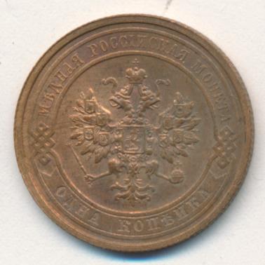 Лицевая сторона — двуглавый орел, надпись МЕДНАЯ РОССIЙСКАЯ МОНЕТА и обозначение номинала (одна копейка); оборотная — обозначение номинала (1 копейка) в бусовом ободке и дата. Нормативный вес — 3,28 грамма, гурт рубчатый.