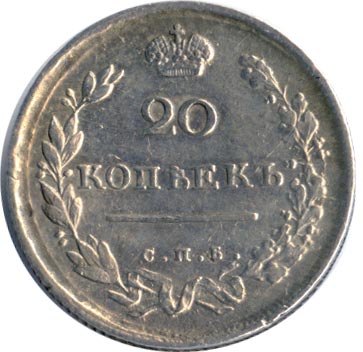 Лицевая сторона - двуглавый орел и дата, оборотная — обозначение номинала (20 копеекъ) в венке из лавровой и дубовой ветвей. Проба до 1813 года — 750, нормативный вес — 4,80 грамма; после 1813 года — проба 868, нормативный вес — 4,15 грамма.