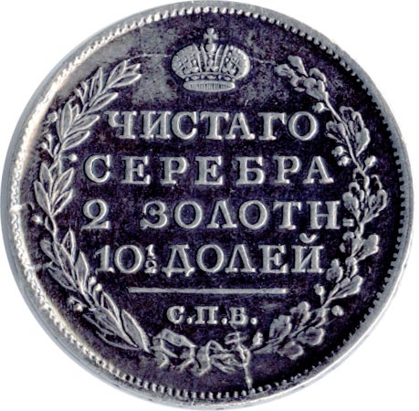 Лицевая сторона - двуглавый орел, дата и надпись «МОНЕТА РУБЛЬ», оборотная — окруженная венком из лавровой и дубовой ветвей надпись «ЧИСТАГО СЕРЕБРА 2 ЗОЛОТН 10 ДОЛЕЙ». Проба — 868, нормативный вес — 10,37 грамма.