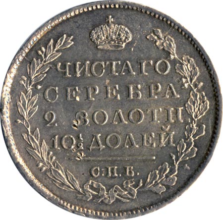 Лицевая сторона - двуглавый орел, дата и надпись «МОНЕТА РУБЛЬ», оборотная — окруженная венком из лавровой и дубовой ветвей надпись «ЧИСТАГО СЕРЕБРА 2 ЗОЛОТН 10 ДОЛЕЙ». Проба — 868, нормативный вес — 10,37 грамма.