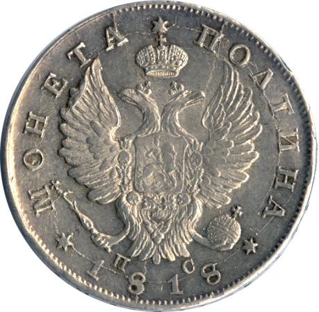 Манифест от 20 июня 1810 года «О новом устройстве монетной системы» устанавливает серебряный рубль законной мерой всех расчетов. Банковые монеты — рубли и полтины — изменяют свой внешний вид. Броская надпись внутри венка на оборотной стороне указывает содержание чистого серебра в монете, а номинал занимает скромное место вокруг орла. Гуртовая надпись сообщает о пробе и лигатурном весе. Выделяют два типа орла.
