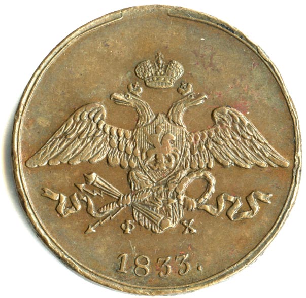 На новой серии медных монет оформление герба как на золотых (с 1817 года) и серебряных (с 1826 года), хотя еще в 1830 году было указано сделать для них орла как на платиновых. Таким образом, вышедшие в 1832 году в обращение новые медные монеты изначально имеют устаревшее оформление, а золотые и серебряные с этого же 1832 года — новое.