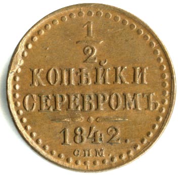 На новых монетах равенство серебряному курсу указано прямо в номинале: «1/2 КОПЕЙКИ СЕРЕБРОМ». Указ об их выпуске следует 6 сентября 1840 года («О новой медной монете на серебро 16-рублевого в пуде достоинства»). Массовая чеканка началось за год до этого на Екатеринбургском (знак ЕМ) и Сузунском (знак СМ) дворах. В качестве временной меры в 1840-1843 годах к ним подключается Ижорский завод (знак СПМ). С 1844 года после «значительного скопления медной монеты в народном обращении» в Екатеринбурге производство прекращается, а в Сузуне сокращается. Варшавский двор (знак MW), получив разрешение на выпуск общегосударственной монеты, успел отчеканить ее лишь в небольшом количестве в 1848 году.